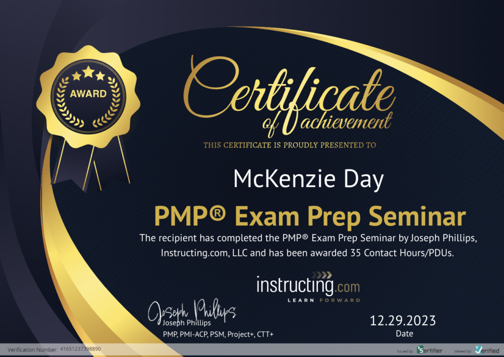 Check out my PMP® Exam Prep Seminar digital certificate/badge issued by Instructing.com, LLC via Sertifier!