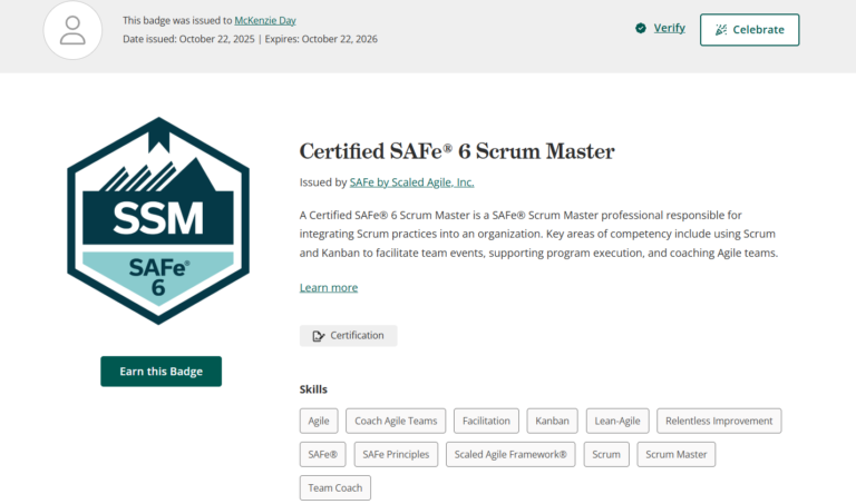 I’m officially a Certified Scrum Master through SAFe by Scaled Agile!